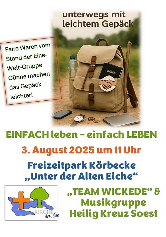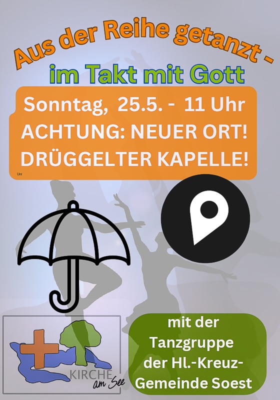 Dieser Gottesdienst am 25. Mai (11 Uhr, Eiche im Freizeitpark in Körbecke) wird von der Tanzgruppe der Soester Pfarrgemeinde Hl. Kreuz gestaltet. Rhythmus, Klang und Bewegung lenken unsere Schritte und Herzen zu Gott.