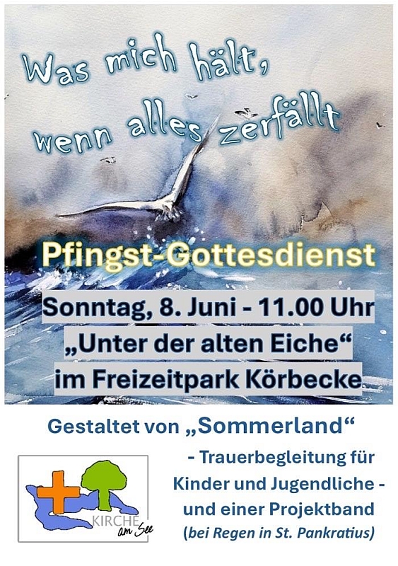 Am Pfingstsonntag wird der Himmel gebeten, alles zu geben: Die Kinder- und Jugend-Trauer-Begleitung „Sommerland“ der Diakonie Ruhr-Hellweg gibt uns einen Einblick in ihre Arbeit. Unter dem Motto "Was mich hält, wenn alles zerfällt" geht es um den Trost, den Beistand und den Mutmacher Gottes – den Heiligen Geist. Die Messe im Körbecker Freizeitpark, unter der alten Eiche am 8. Juni um 11:00 Uhr, wird mit ermutigenden Liedern hoffnungsvoll gestaltet.