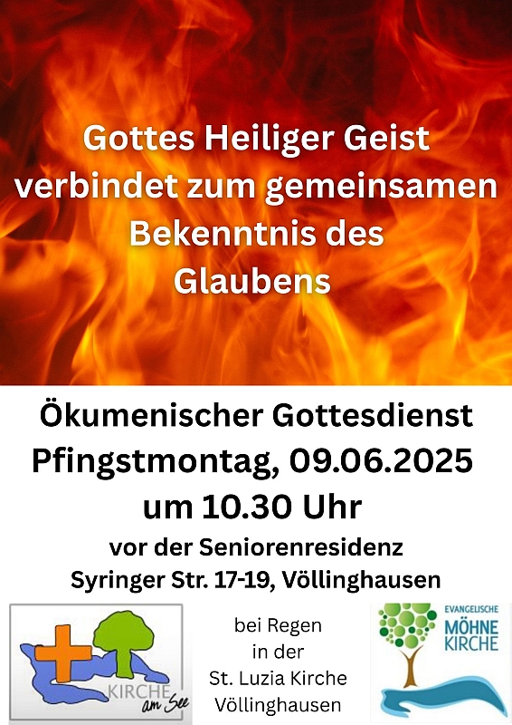 Ein ökumenischer Gottesdienst wird am Pfingstmontag am 9. Juni in Völlinghausen gefeiert: um 10.30 Uhr laden die katholische und die evangelische Kirche zum „Gottesdienst der Generationen“ an der Seniorenresidenz ein. Pfarrerin Pothmann und Gemeindereferent Michael Klagges schauen auf das verbindende Glaubensbekenntnis, das in diesem Jahr 1700 Jahre alt wird. Jutta Ebbert und Anna Bornhoff gestalten die Musik dazu.