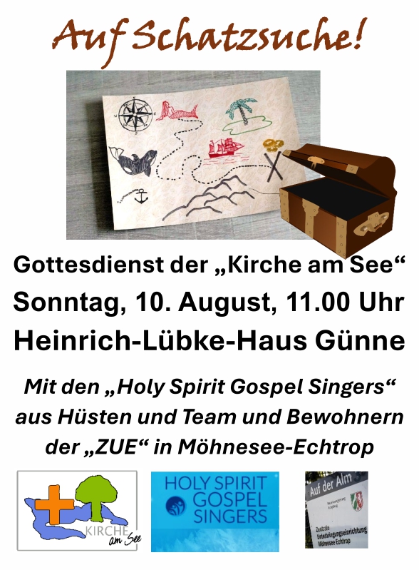 Mit uns feiern Flüchtlinge und Betreuer von der ZUE Echtrop am Sonntag, 10. August 11.00 Uhr den Gottesdienst am Heinrich-Lübke-Haus. Dabei gehen wir zusammen auf Schatzsuche: Wovon können alle leben? Welcher Reichtum können Menschen füreinander sein? Was verbindet die Menschen? Wer sucht, wird finden!