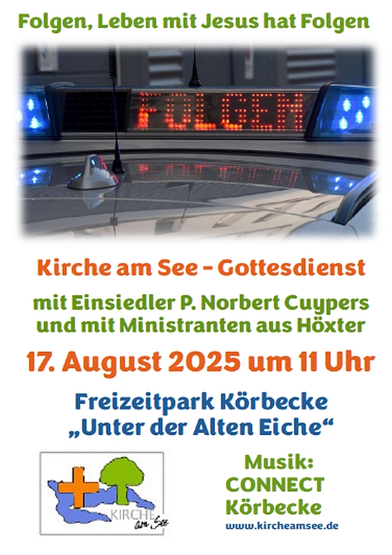 Wir laden zum Gottesdienst am Sonntag, 31. August, um 11 Uhr unter der alten Eiche im Seepark ein. Zur Feier wird ein Ehrengast erwartet; dazu gibt es diesmal Eintrittskarten, die in der Pankratius Kirche sowie am Stand der Kirche am See beim Ehrenamtstag am Samstag, 30. August, an der Seetreppe erhältlich sind - Restkarten am Sonntag vor Ort.