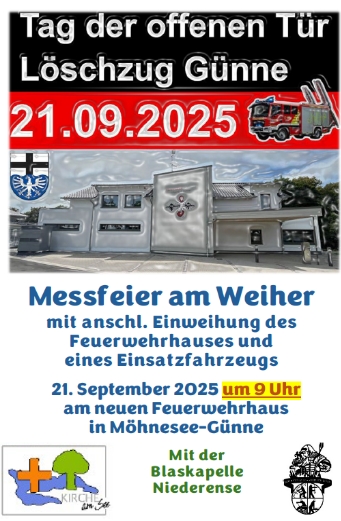 Der Gottesdienst der Kirche am See und die Messfeier von Hewingsen gehen zusammen nach Günne: am 21.9. ist dort die Einweihung des neuen Feuerwehr-Gerätehauses und eines neuen Einsatzfahrzeugs. Aus diesem Anlass feiert die Kirche am See die Hl. Messe um 9 Uhr am Feuerwehrhaus in Günne. Musiker der Blaskapelle Niederense gestalten den Gottesdienst festlich mit.